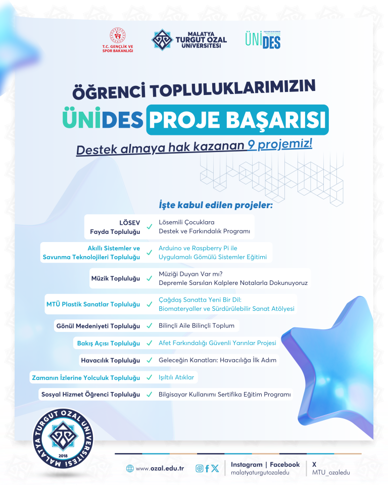Malatya Turgut Özal Üniversitesi (MTÜ), ÜNİDES - Üniversite Öğrenci Kulüplerini Destekleme Programı kapsamında, gençlerimizin kişisel, akademik ve sosyal gelişimlerine katkıda bulunurken, aynı zamanda topluma fayda sağlamayı hedefleyen projelerle büyük bir başarı elde etti. Destek almaya hak kazanan projeler, hem yerel hem de ulusal düzeyde geniş bir etki yaratmayı amaçlıyor.